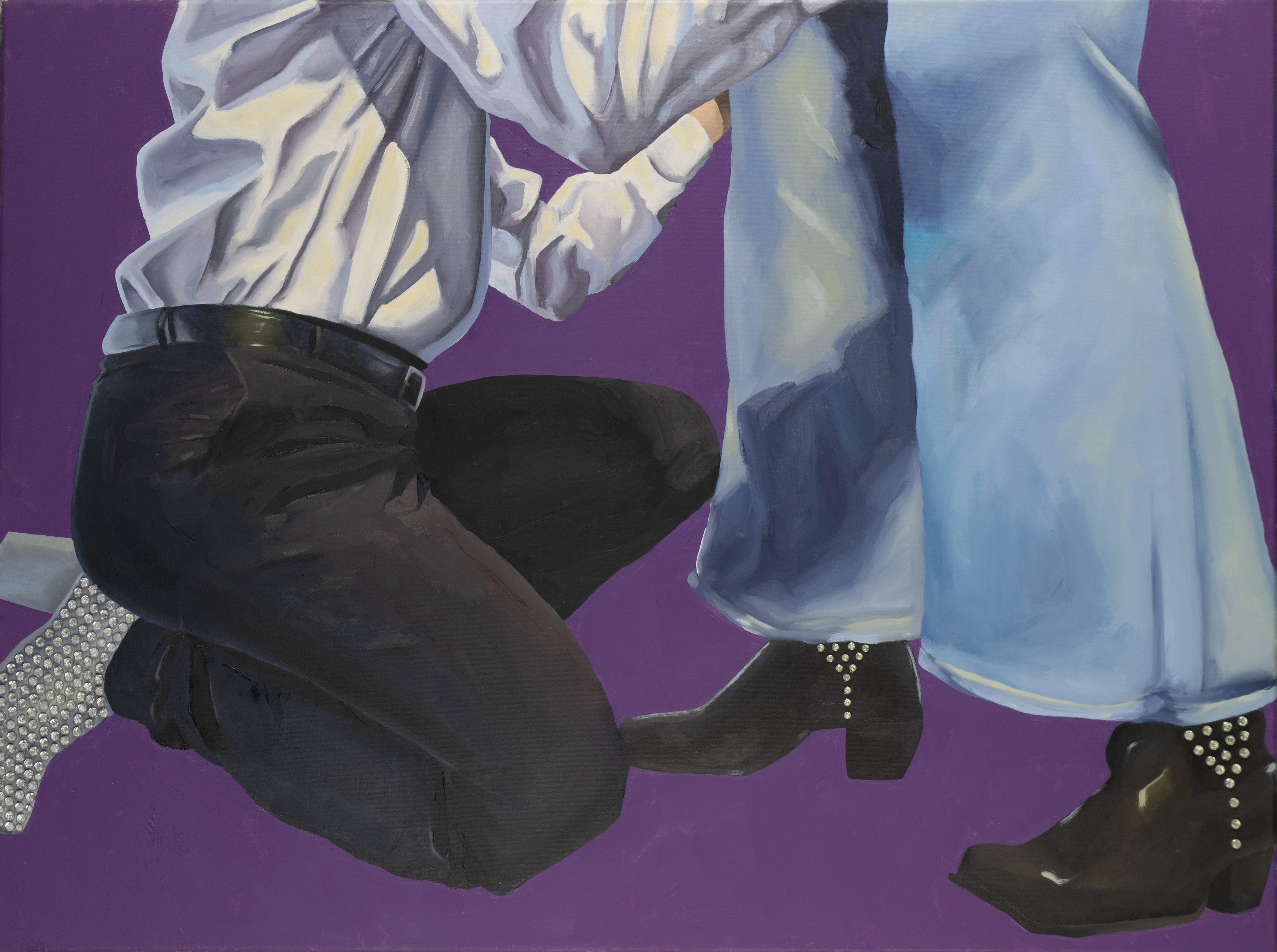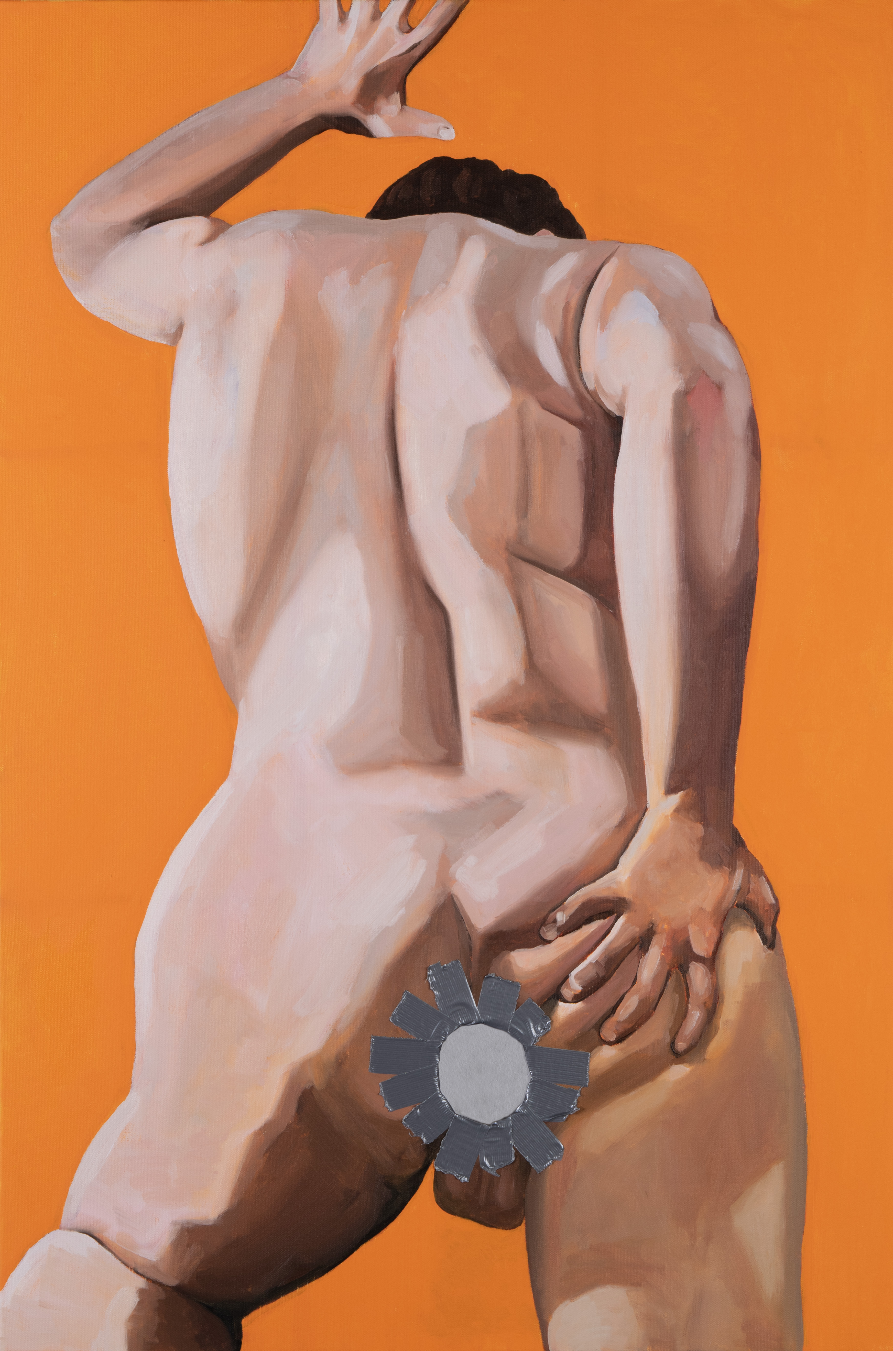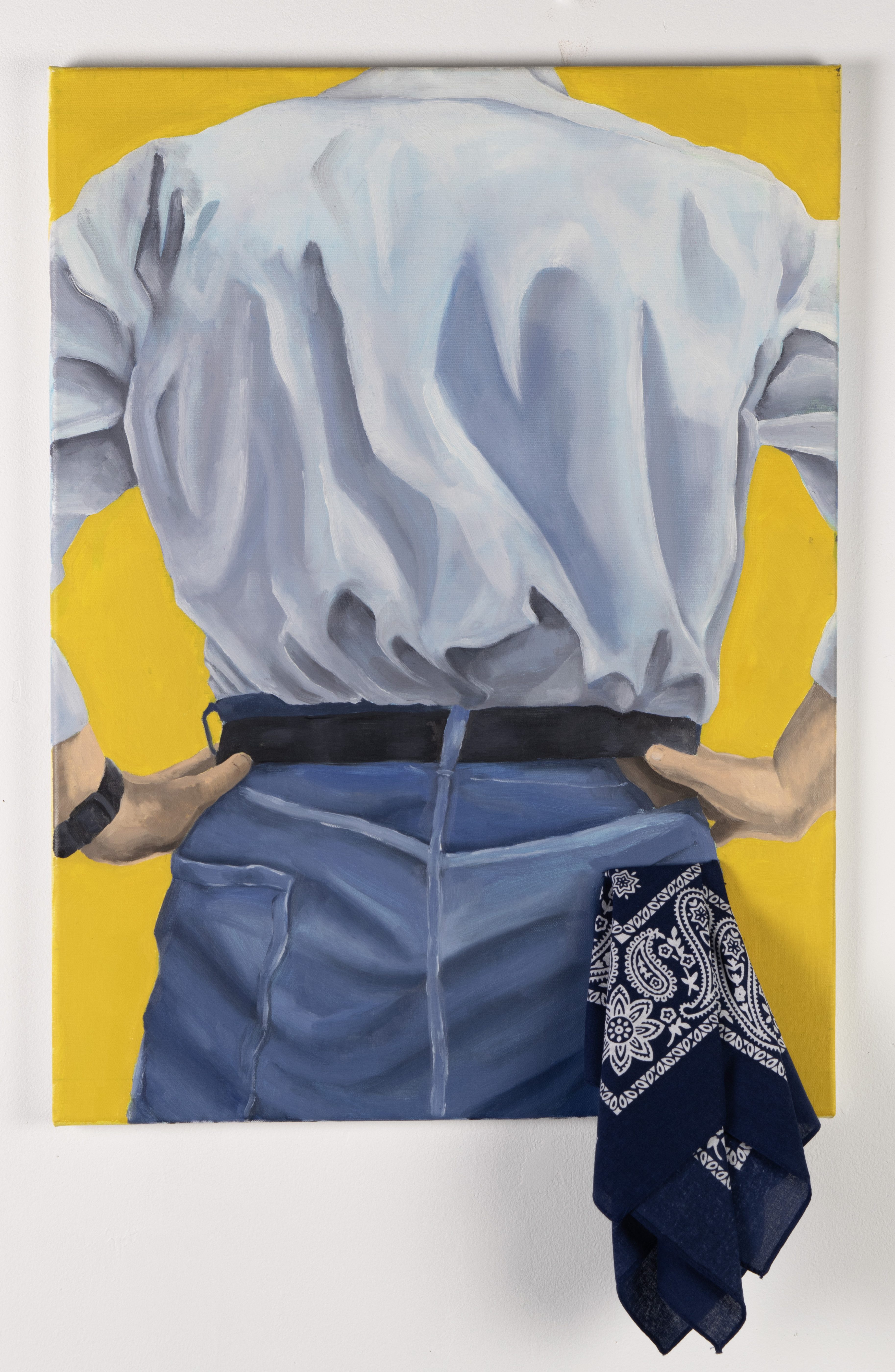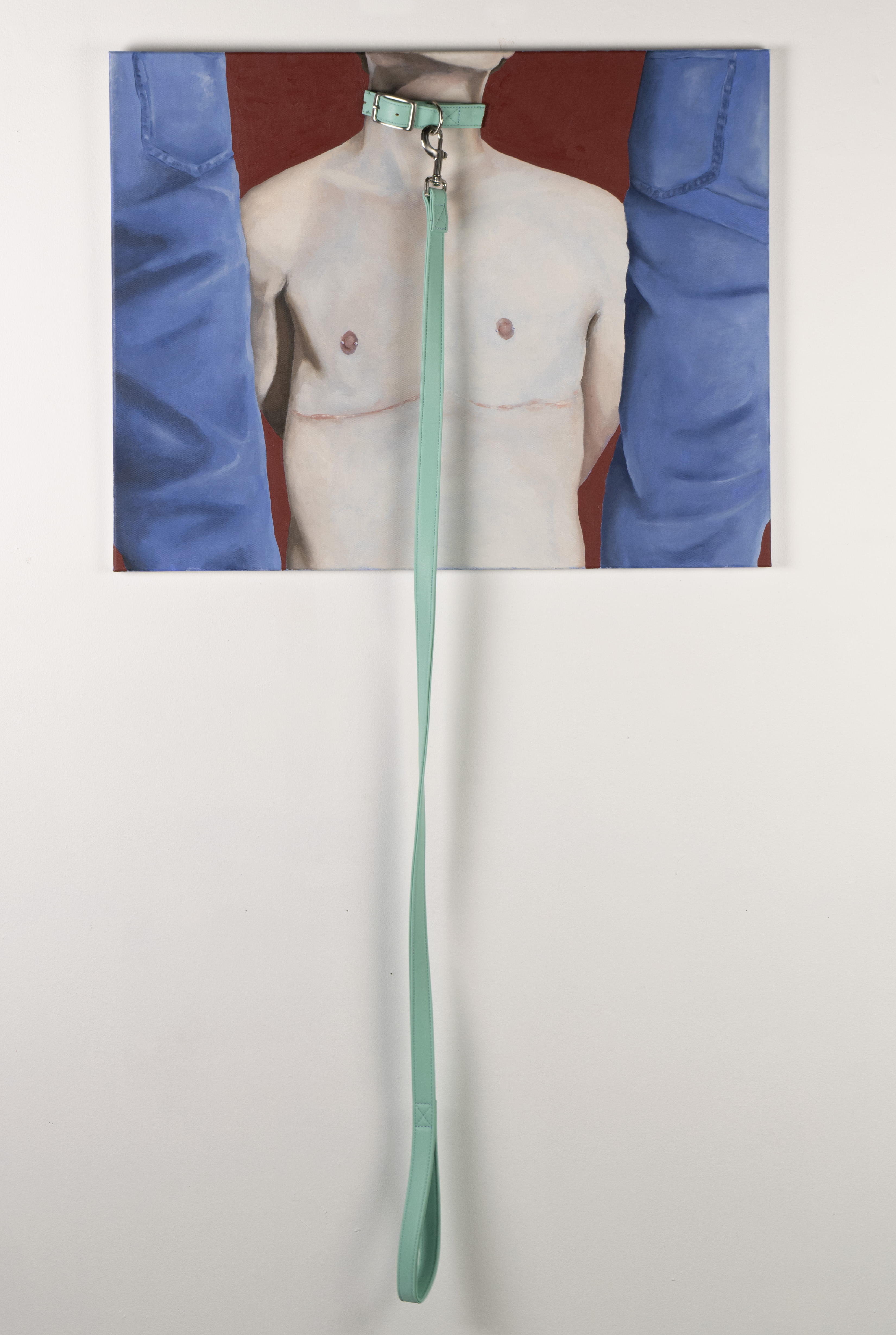 “The Physicality of Queerness” has two meanings. “Physicality” in the sense of the physical material culture of gay men, as well as “physicality” in the sense of sex and sexuality. This duality is explored with physical elements added onto oil paintings. Together the images and the materials celebrate the nitty gritty: the leather, pearls, beard burn, spit, and sweat. Queerness and queer sexuality often have to be sanitized in order to be acceptable or palatable, where straight and cisgender depictions of sex and sexuality are celebrated and esteemed. As a gay man, I seek to elevate queerness. Dedicated to all the freaks, faggots, and transsexuals.